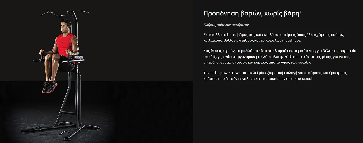 Εκμεταλλευτείτε το βάρος σας και εκτελέστε ασκήσεις όπως έλξεις, άρσεις ποδιών, κοιλιακούς, βυθίσεις στήθους και τρικεφάλων ή push ups. Στις θέσεις χεριών, τα μαξιλάρια είναι σε ελαφρά εσωτερική κλίση για βέλτιστη ισορροπία στο δίζυγο, ενώ το εργονομικό μαξιλάρι πλάτης κόβεται στο ύψος της μέσης για να σας επιτρέπει άνετες εκτάσεις και κάμψεις από το ύψος των γοφών. Το adidas power tower αποτελεί μία εξαιρετική επιλογή για αρχάριους και έμπειρους χρήστες που ζητούν μεγάλη ευχέρεια ασκήσεων σε μικρό χώρο!