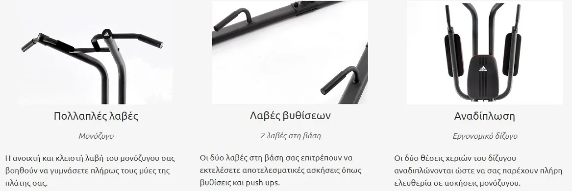 Με την εγγύηση ποιότητας της Adidas, το Μονόζυγο-Δίζυγο 10260 υπόσχεται μία πλήρη προπόνηση βασισμένη μόνο στο βάρος του σώματός σας. Με τον κατάλληλο εξοπλισμό, η μετακίνηση του βάρους σας μπορεί να σας προσφέρει όλα τα οφέλη που έχετε σηκώνοντας αλτήρες. Αποκτήστε τη δυνατότητα να ασκηθείτε ενάντια στη βαρύτητα, για τους επάνω και τους κάτω μύες του κορμού, αλλά και εκείνους του στήθους ή των ώμων. Μπορείτε να εκτελέσετε κλασικές ασκήσεις όπως μονόζυγο, βυθίσεις και κάθετες άρσεις γονάτων.