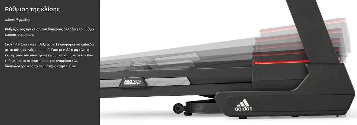 Σχεδιασμένος για απαιτητικές προπονήσεις, ο Adidas Τ-19 έρχεται με πανίσχυρο δεκαετούς εγγύησης κινητήρα 3.5HP και την τεχνολογία απορρόφησης κραδασμών NRG. Επιλέξτε ανάμεσα σε συνολικά 37 προγράμματα άσκησης, ανεβάστε την ταχύτητα έως 20 km/h και την κλίση σε 15 επίπεδα, όλα αυτά καθώς παρακολουθείτε όλα τα δεδομένα της άσκησης στην πλήρως λειτουργική οθόνη LCD 8".