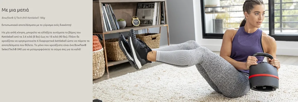 - Ευελιξία και εργονομία: Μόνο το Kettlebell Bowflex® SelectTech® μπορεί να σας δώσει τόση ευελιξία! Επιλέξτε το επιθυμητό βάρος απλά περιστρέφοντας ένα διακόπτη και μεταμορφώστε οποιονδήποτε χώρο στο προσωπικό σας γυμναστήριο!
