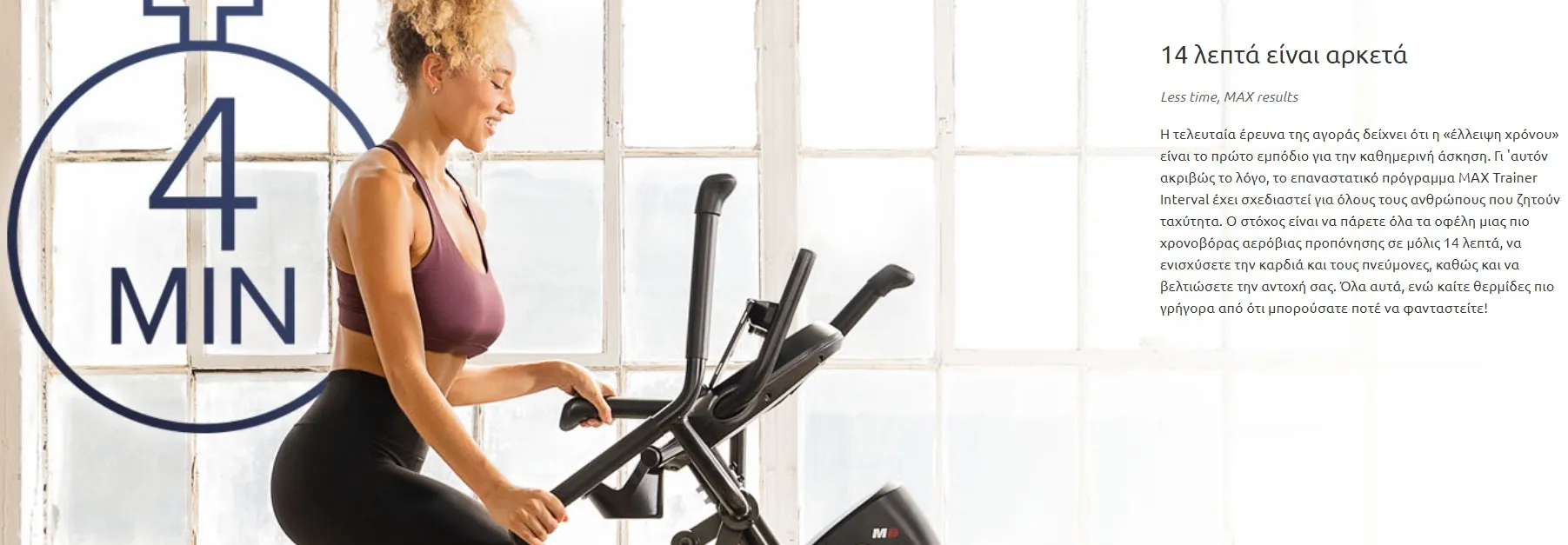 - 14 λεπτά είναι αρκετά: Η τελευταία έρευνα της αγοράς δείχνει ότι η «έλλειψη χρόνου» είναι το πρώτο εμπόδιο για την καθημερινή άσκηση. Γι 'αυτόν ακριβώς το λόγο, το επαναστατικό πρόγραμμα MAX Trainer Ιnterval έχει σχεδιαστεί για όλους τους ανθρώπους που ζητούν ταχύτητα. Ο στόχος είναι να πάρετε όλα τα οφέλη μιας πιο χρονοβόρας αερόβιας προπόνησης σε μόλις 14 λεπτά, να ενισχύσετε την καρδιά και τους πνεύμονες, καθώς και να βελτιώσετε την αντοχή σας. Όλα αυτά, ενώ καίτε θερμίδες πιο γρήγορα από ότι μπορούσατε ποτέ να φανταστείτε!