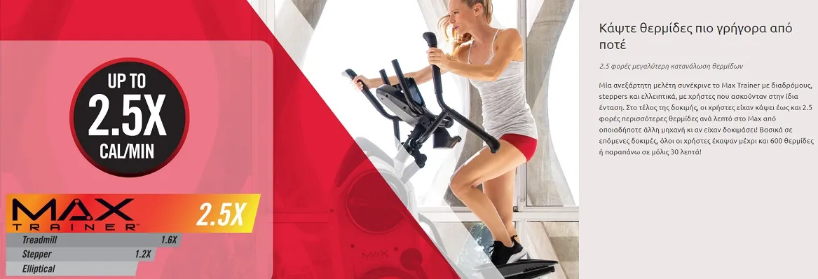 - 2.5 φορές μεγαλύτερη κατανάλωση θερμίδων: Μία ανεξάρτητη μελέτη συνέκρινε το Max Trainer με διαδρόμους, steppers και ελλειπτικά, με χρήστες που ασκούνταν στην ίδια ένταση. Στο τέλος της δοκιμής, οι χρήστες είχαν κάψει έως και 2.5 φορές περισσότερες θερμίδες ανά λεπτό στο Max από οποιαδήποτε άλλη μηχανή κι αν είχαν δοκιμάσει! Βασικά σε επόμενες δοκιμές, όλοι οι χρήστες έκαψαν μέχρι και 600 θερμίδες ή παραπάνω σε μόλις 30 λεπτά!