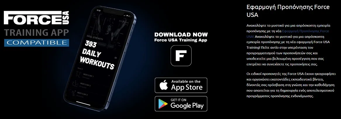 Ανακαλύψτε το μυστικό για μια απρόσκοπτη εμπειρία προπόνησης με τη νέα Εφαρμογή Προπόνησης Force USA! Ανακαλύψτε το μυστικό για μια απρόσκοπτη εμπειρία προπόνησης με τη νέα εφαρμογή Force USA Training! Πείτε αντίο στην υπερένταση του προγραμματισμού των προπονήσεών σας και υποδεχτείτε μια βελτιωμένη προσέγγιση που σας επιτρέπει να συνεχίσετε τις προπονήσεις σας. Οι ειδικοί προπονητές της Force USA έχουν ηχογραφήσει και οργανώσει εκατοντάδες εκπαιδευτικά βίντεο, δίνοντάς σας πρόσβαση στη γνώση και την καθοδήγηση που απαιτείται για τη δημιουργία ενός αποτελεσματικού προγράμματος προπόνησης ενδυνάμωσης.