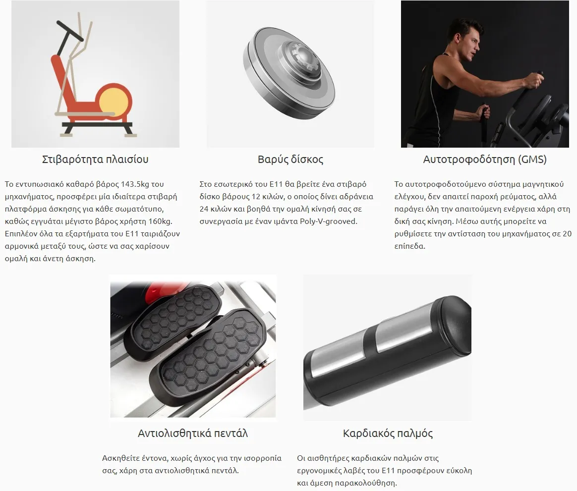 - Καρδιακός παλμός: Οι αισθητήρες καρδιακών παλμών στις εργονομικές λαβές του Ε11 προσφέρουν εύκολη και άμεση παρακολούθηση.