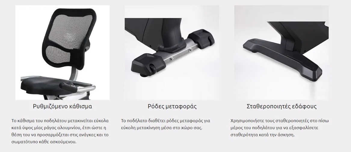 - Ρυθμιζόμενο κάθισμα: Το κάθισμα του ποδηλάτου μετακινείται εύκολα κατά ύψος μίας ράγας αλουμινίου, έτσι ώστε η θέση του να προσαρμόζεται στις ανάγκες και το σωματότυπο κάθε ασκούμενου.