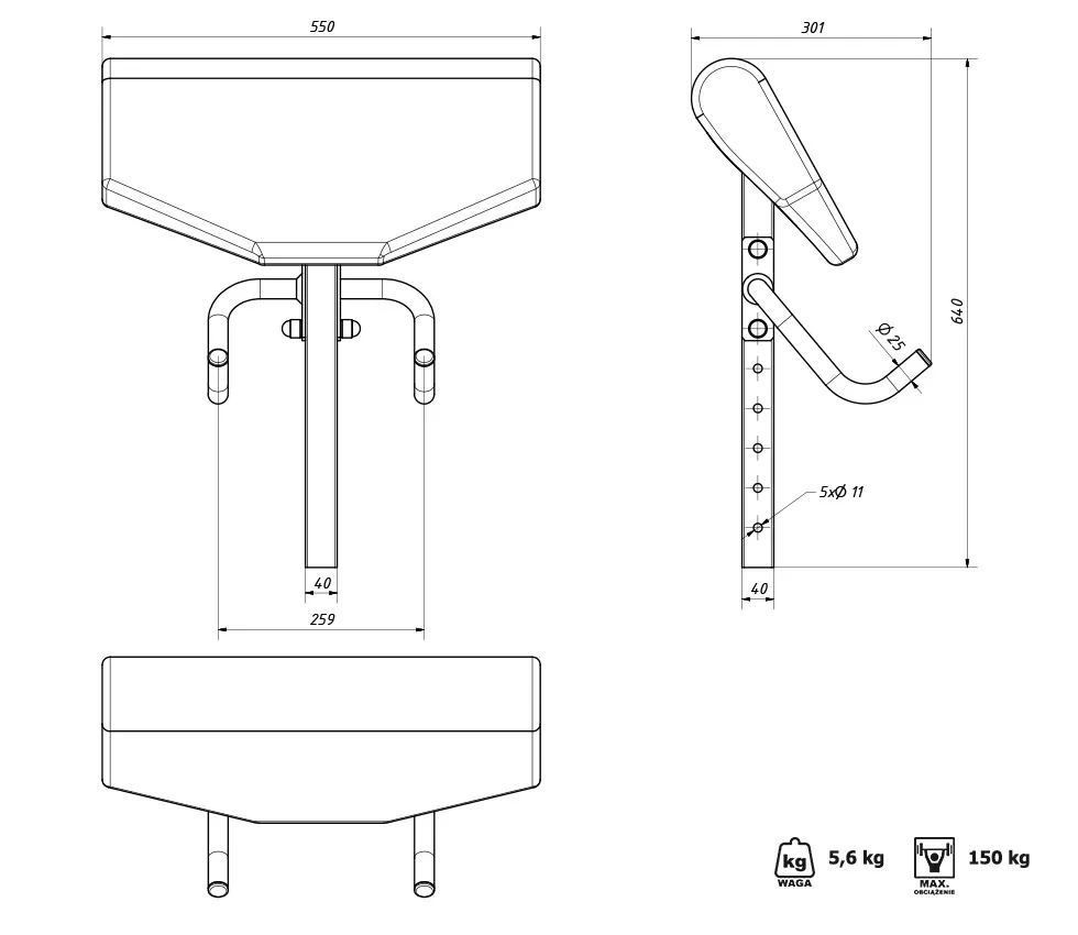 Η κατασκευή είναι στιβαρή και διαθέτει ανθεκτικό σκελετό 40x40 mm ώστε να προσδίδει σταθερότητα όταν χρησιμοποιηθεί ως προσάρτημα κάποιου μηχανήματος. Το ύψος του εξαρτήματος ρυθμίζεται σε 5 σημεία έτσι ώστε ο κάθε χρήστης να το τοποθετεί ανάλογα με το σώμα και τις ανάγκες του.