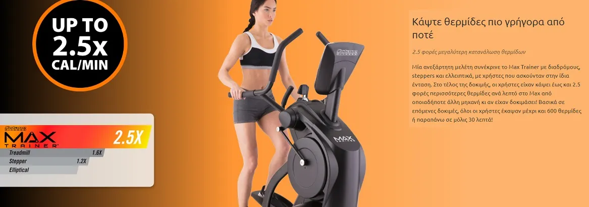 - 2.5 φορές μεγαλύτερη κατανάλωση θερμίδων: Μία ανεξάρτητη μελέτη συνέκρινε το Max Trainer με διαδρόμους, steppers και ελλειπτικά, με χρήστες που ασκούνταν στην ίδια ένταση. Στο τέλος της δοκιμής, οι χρήστες είχαν κάψει έως και 2.5 φορές περισσότερες θερμίδες ανά λεπτό στο Max από οποιαδήποτε άλλη μηχανή κι αν είχαν δοκιμάσει! Βασικά σε επόμενες δοκιμές, όλοι οι χρήστες έκαψαν μέχρι και 600 θερμίδες ή παραπάνω σε μόλις 30 λεπτά!