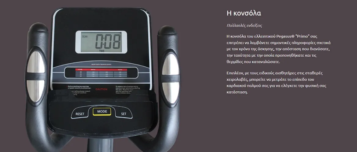Το ελλειπτικό Pegasus "Primo" είναι ένας εξαιρετικός συνδυασμός ποιότητας και τιμής! Προσφέρει 8 μηχανικά ρυθμιζόμενα επίπεδα αντίστασης ώστε να φέρετε τη δυσκολία της άσκησης εκεί που θέλετε για να επιτύχετε τους στόχους σας, στιβαρό δίσκο με βάρος αδράνειας 10 κιλών για ομαλή κίνηση και ένα αξιόλογο μήκος βήματος 34 εκατοστών. Η κονσόλα του ελλειπτικού Pegasus "Primo" σας επιτρέπει να λαμβάνετε σημαντικές πληροφορίες σχετικά με τον χρόνο της άσκησης, την απόσταση που διανύσατε, την ταχύτητα με την οποία προπονηθήκατε και τις θερμίδες που καταναλώσατε. Επιπλέον, με τους ειδικούς αισθητήρες στις σταθερές χειρολαβές, μπορείτε να μετράτε το επίπεδο του καρδιακού παλμού σας για να ελέγχετε την φυσική σας κατάσταση.