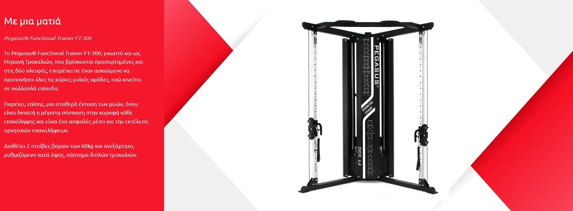 Το Pegasus® Functional Trainer FT-300, γνωστό και ως Μηχανή Τροχαλιών, που βρίσκονται προσαρτημένες και στις δύο πλευρές, επιτρέπει σε έναν ασκούμενο να προπονήσει όλες τις κύριες μυϊκές ομάδες, ενώ κινείται σε πολλαπλά επίπεδα. Παρέχει, επίσης, μια σταθερή ένταση των μυών, όπου είναι δυνατή η μέγιστη σύσπαση στην κορυφή κάθε επανάληψης και είναι ένα ασφαλές μέσο για την εκτέλεση αρνητικών επαναλήψεων. Διαθέτει 2 στοίβες βαρών των 60kg και ανεξάρτητο, ρυθμιζόμενο κατά ύψος, σύστημα διπλών τροχαλιών.