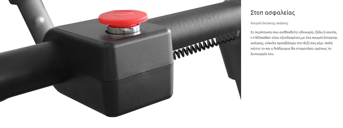 - Στοπ ασφαλείας - Κουμπί έκτακτης ανάγκης: Σε περίπτωση που αισθανθείτε αδυναμία, ζάλη ή ναυτία, ο MEDwalker είναι εξοπλισμένος με ένα κουμπί έκτακτης ανάγκης, εύκολα προσβάσιμο στο δεξί σας χέρι. Απλά πιέστε το και ο διάδρομος θα σταματήσει αμέσως τη λειτουργία του.