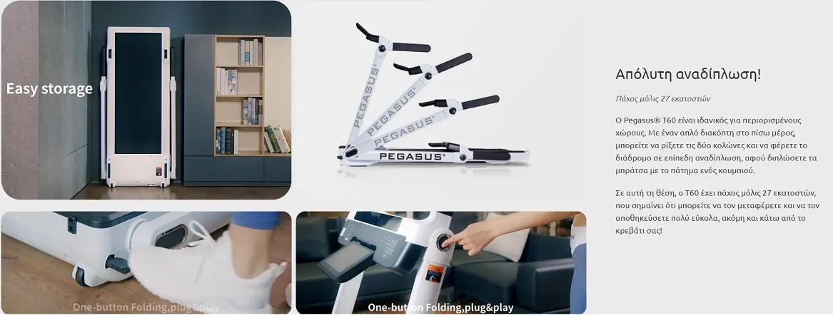 - Απόλυτη αναδίπλωση!: Ο Pegasus® T60 είναι ιδανικός για περιορισμένους χώρους. Με έναν απλό διακόπτη στο πίσω μέρος, μπορείτε να ρίξετε τις δύο κολώνες και να φέρετε το διάδρομο σε επίπεδη αναδίπλωση, αφού διπλώσετε τα μπράτσα με το πάτημα ενός κουμπιού. Σε αυτή τη θέση, ο Τ60 έχει πάχος μόλις 27 εκατοστών, που σημαίνει ότι μπορείτε να τον μεταφέρετε και να τον αποθηκεύσετε πολύ εύκολα, ακόμη και κάτω από το κρεβάτι σας!