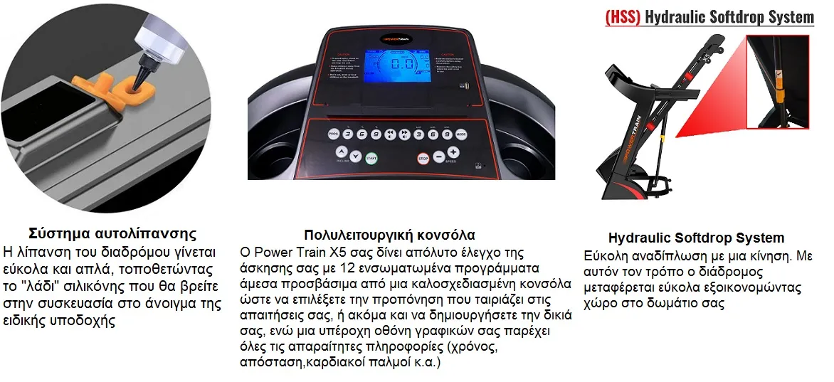 - Πολυλειτουργική κονσόλα: O Power Train X5 σας δίνει απόλυτο έλεγχο της άσκησης σας με 12 ενσωματωμένα προγράμματα άμεσα προσβάσιμα από μια καλοσχεδιασμένη κονσόλα με πλήκτρα ταχείας επιλογής, ώστε να επιλέξετε την προπόνηση που ταιριάζει στις απαιτήσεις σας, ή ακόμα και να δημιουργήσετε την δικιά σας, ενώ μια υπέροχη οθόνη γραφικών σας παρέχει όλες τις απαραίτητες πληροφορίες (χρόνος, απόσταση, καρδιακοί παλμοί κ.α.)